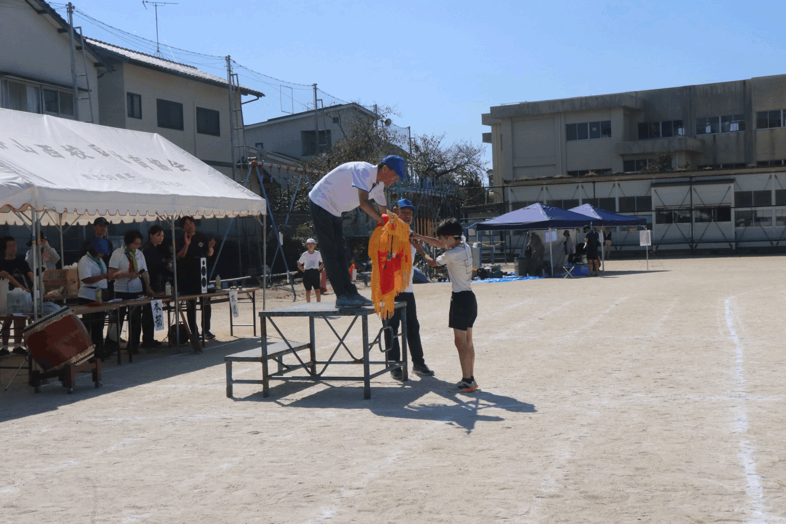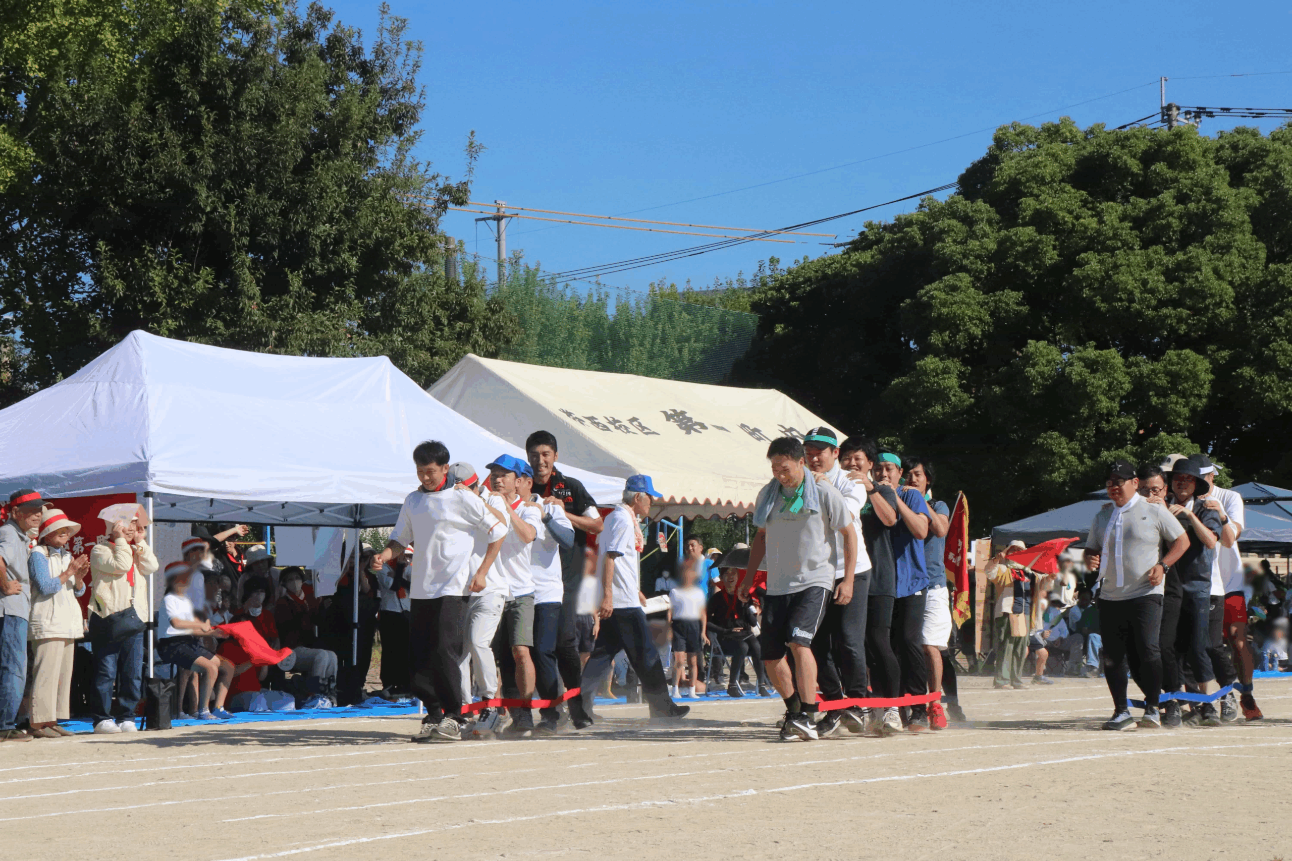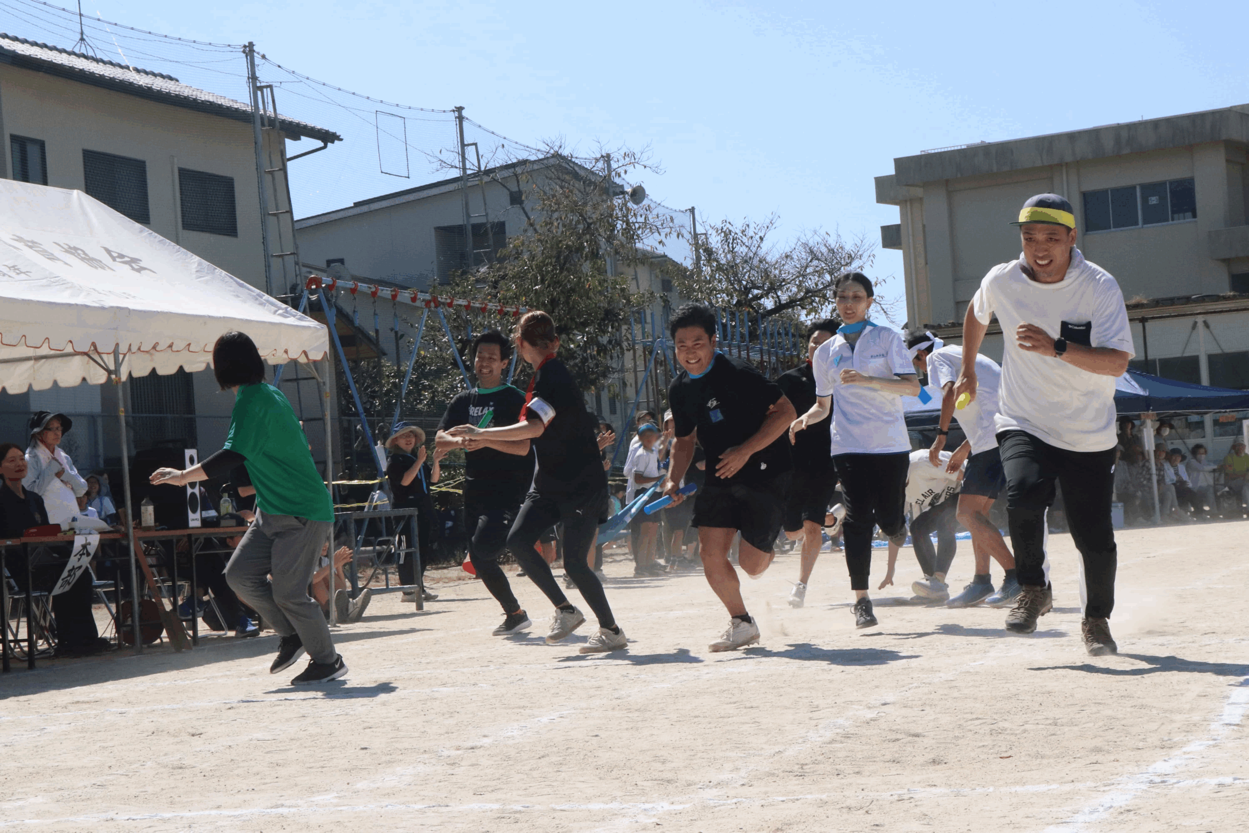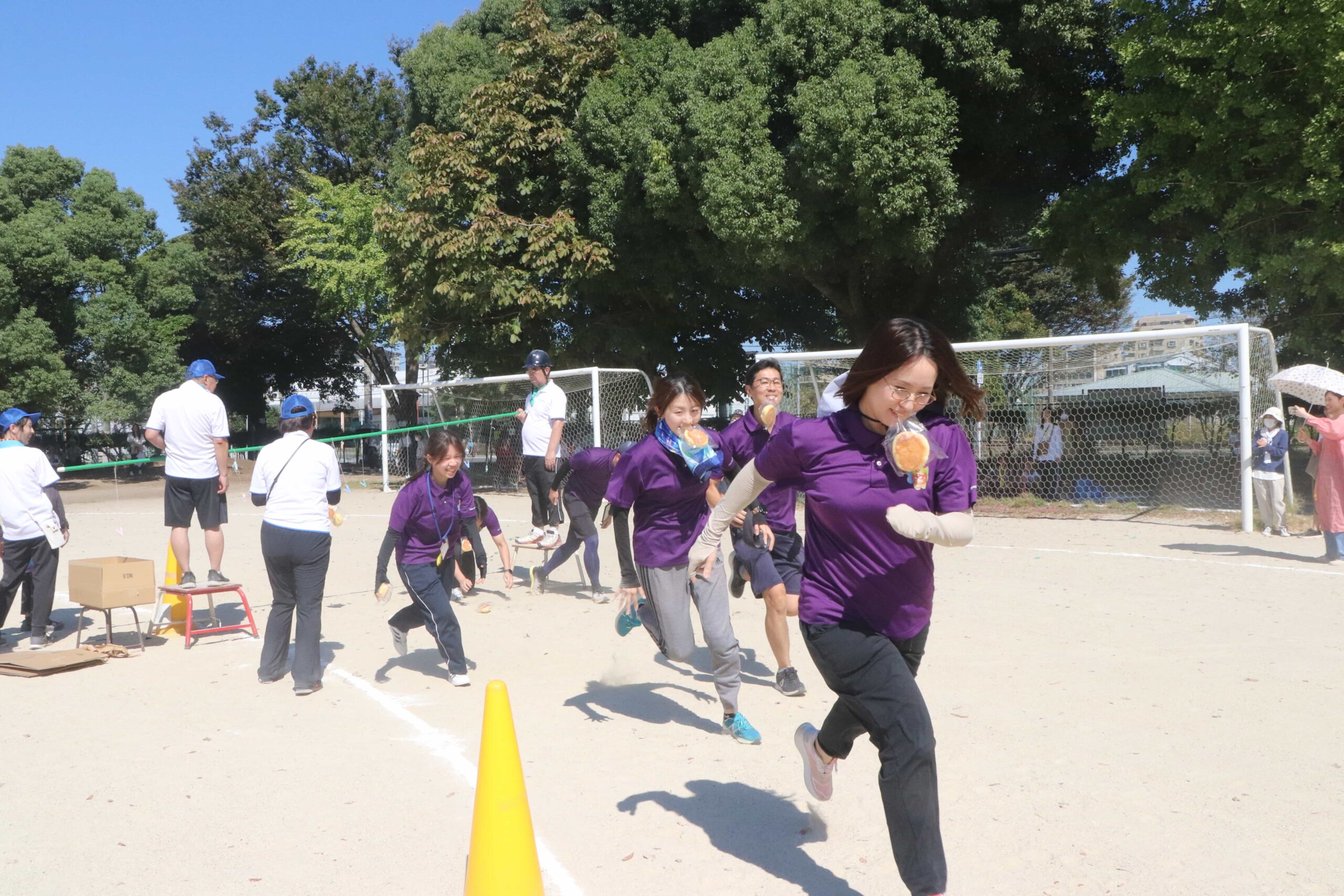 スプーンリレーから始まり、輪投げ、久しぶりに復活したムカデ競走、小学校の先生チームも参加された玉入れ、町内対抗リレー等各町内の応援で大いに盛り上がりました