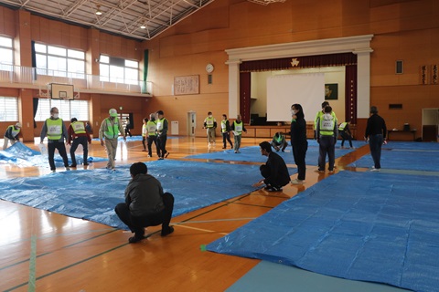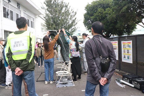 午前8時30分から避難所運営委員の皆さんが避難所の開設準備を行い、午前9時から避難者役の参加者の受付誘導訓練が行われました。昨年度の訓練の経験を活かしてスムーズに作業は進んでいましたが、色々と反省点も見つかったようです。