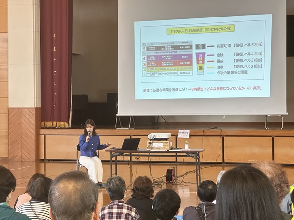 午前10時20分からは、RKKアナウンサーの坂本くるみ様の講演会があり、災害への心構えや避難情報の解説など役に立つ情報を分かりやすくお話しいただきました。