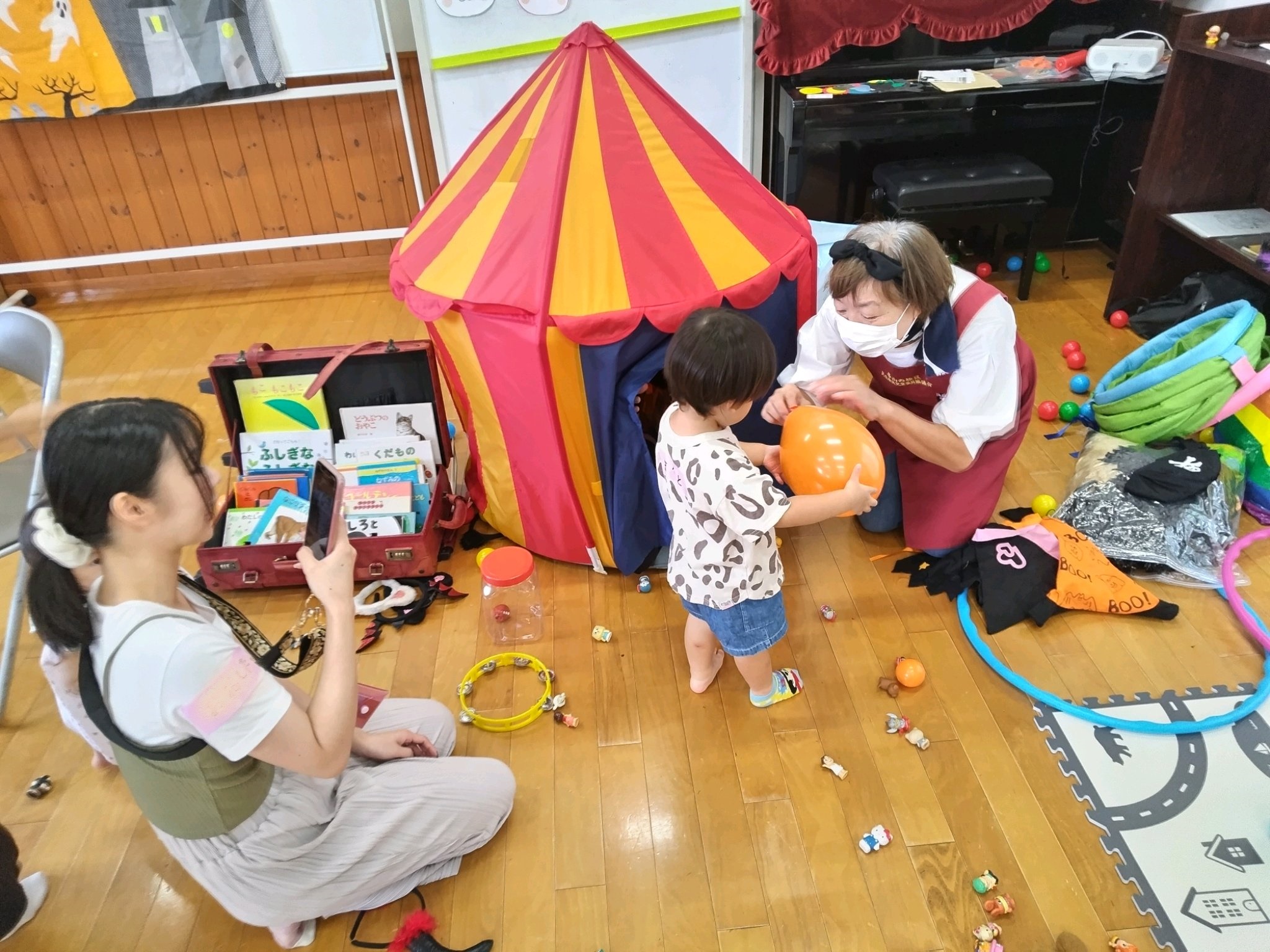 ハロウィンの歌やお話のあと、こどもたちには風船をプレゼント!