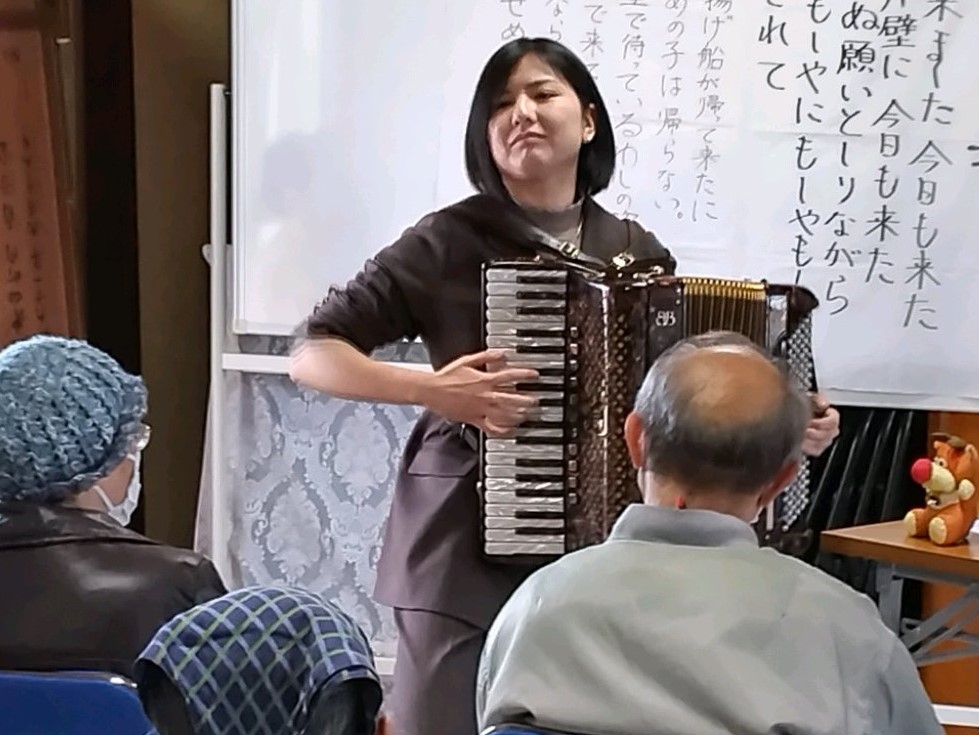 19日の帯山会館には、小林先生の教え子で、11月に留学先フランスのインターナショナルオープントロフィーで優勝し凱旋帰国中のアコーディオン奏者 市原朋奈さんも特別出演、「#パリの空の下」「#愛の讃歌」など名曲を披露しました。