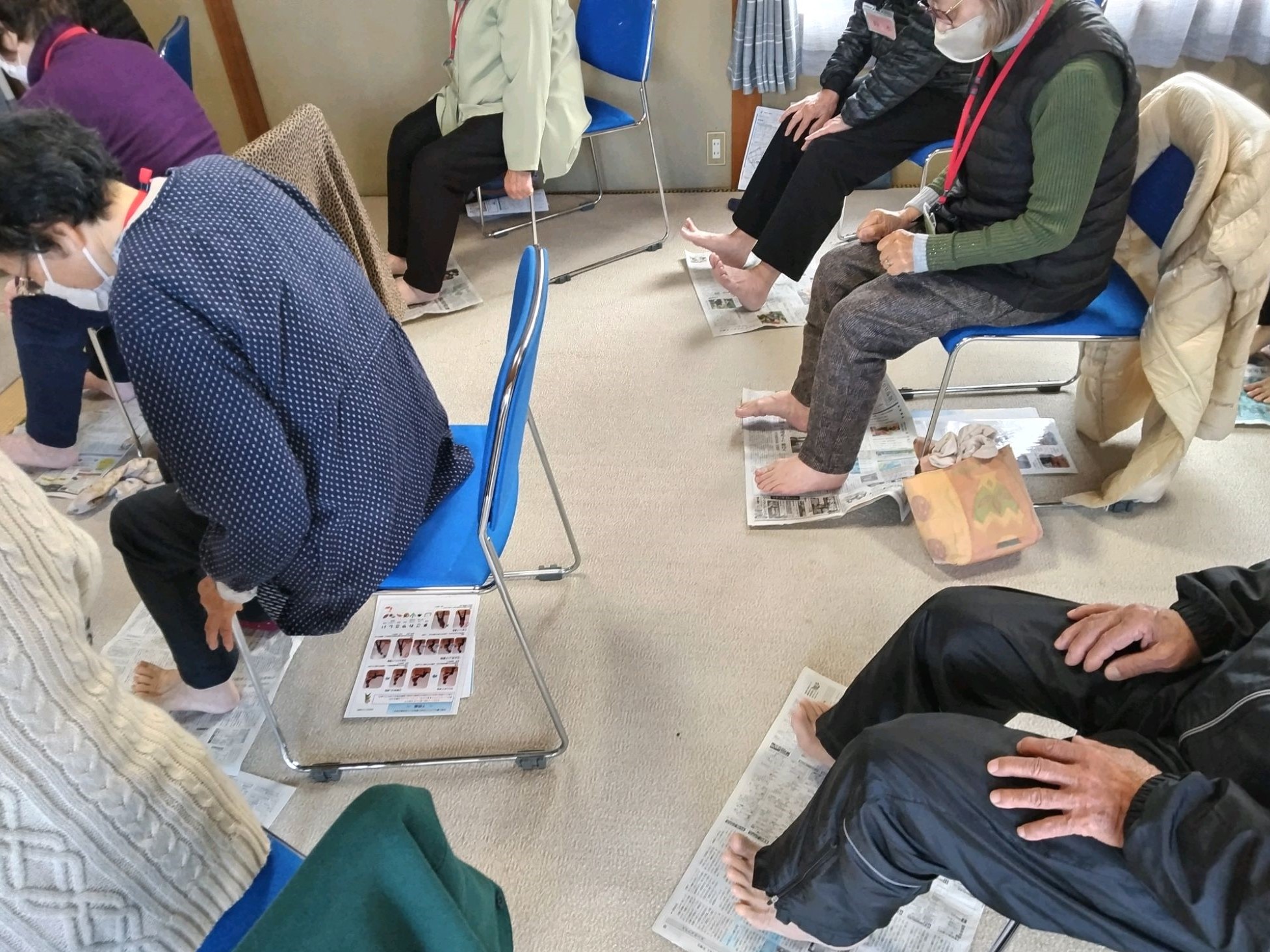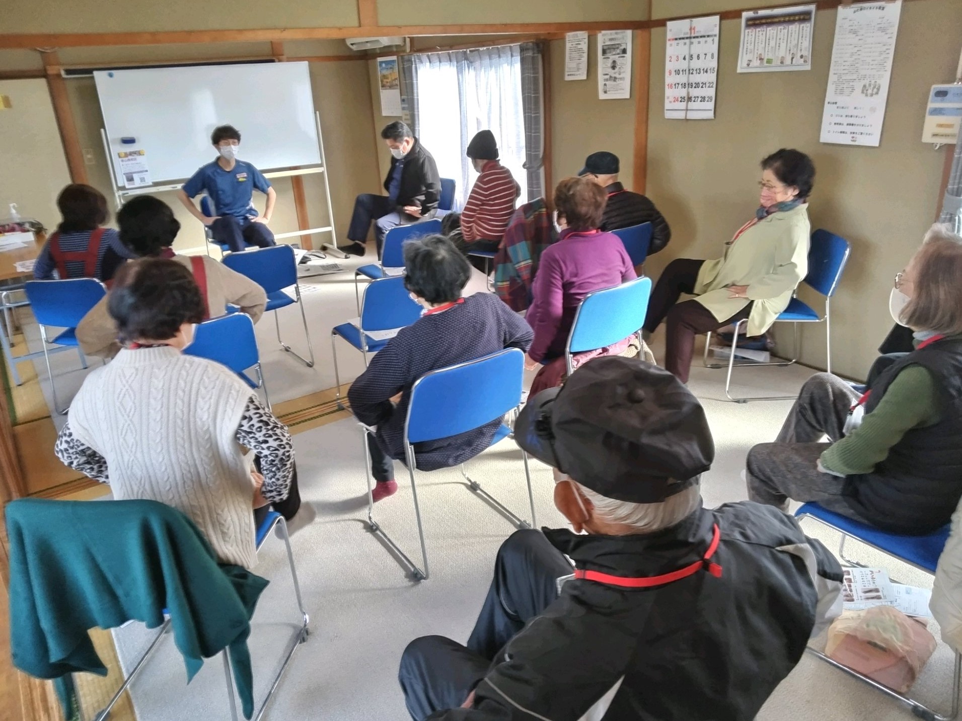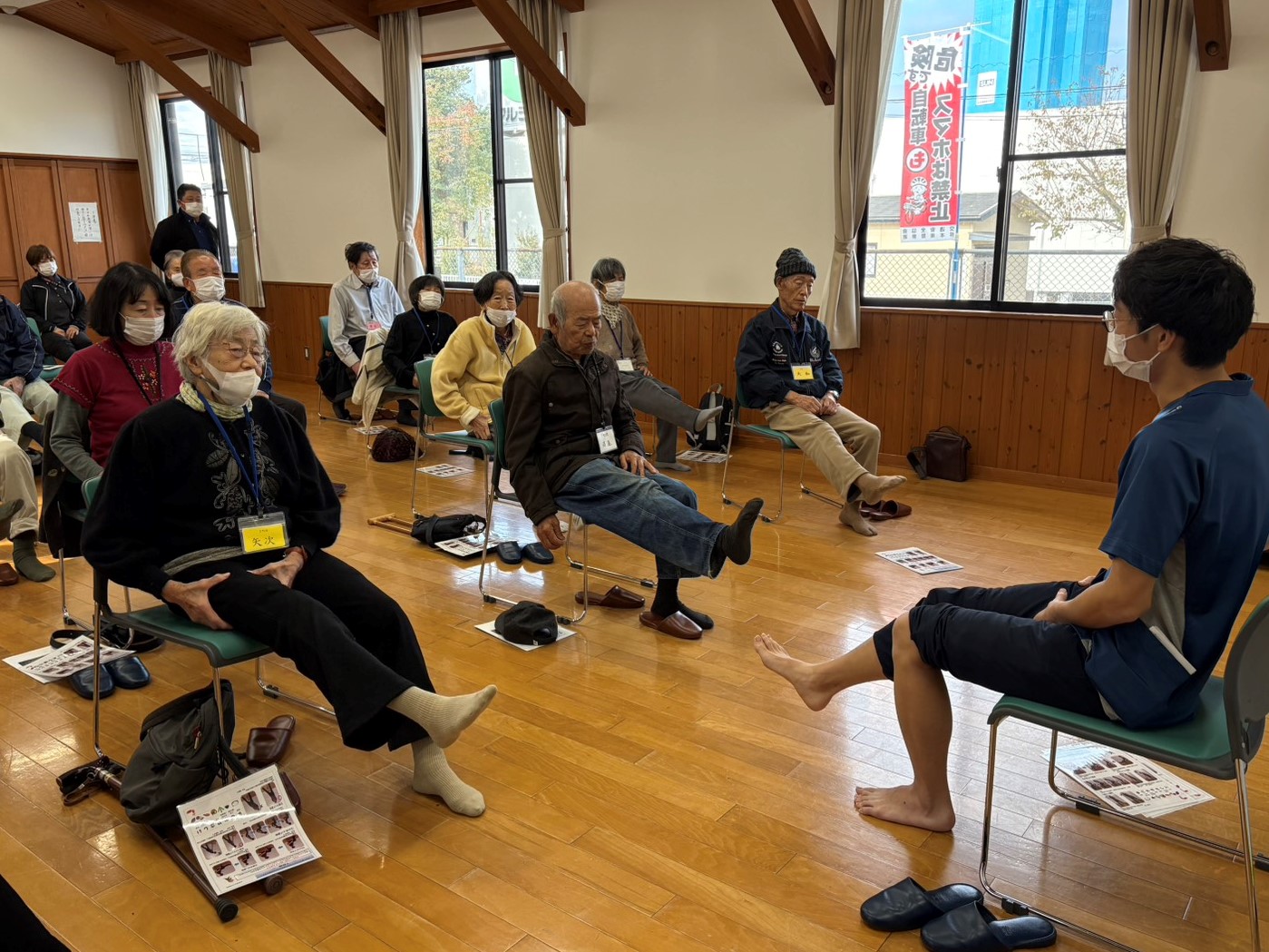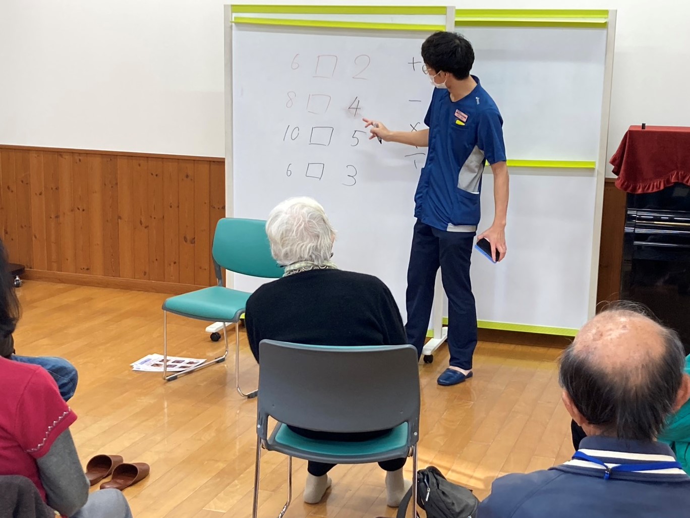 講師の水前寺とうや病院・理学療法士 寺沢佳太さんの指導で、下肢中心の「スロー筋トレ」や「足指の運動」、計算や漢字などを使った「脳トレ」に取り組みました。