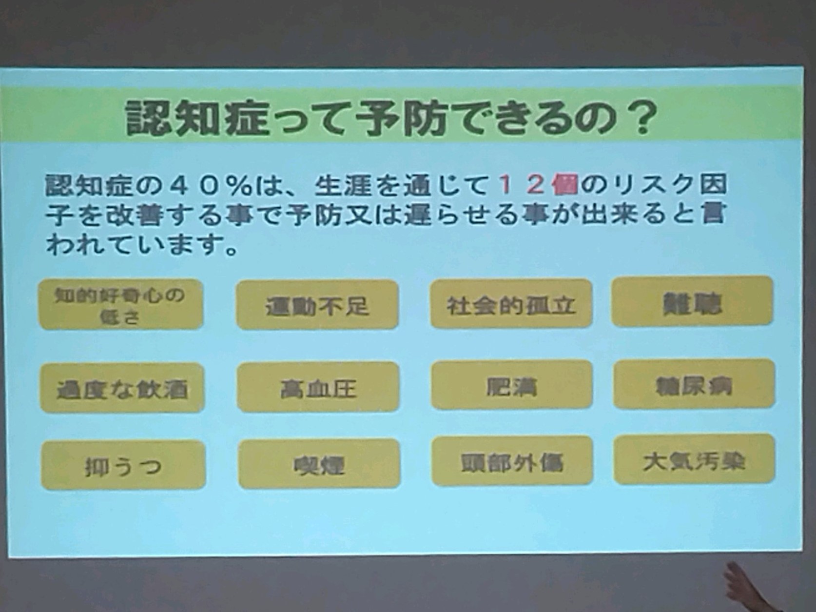 講師は「認知症を予防、または遅らせるために12のリスク因子を改善しましょう」と力説しました