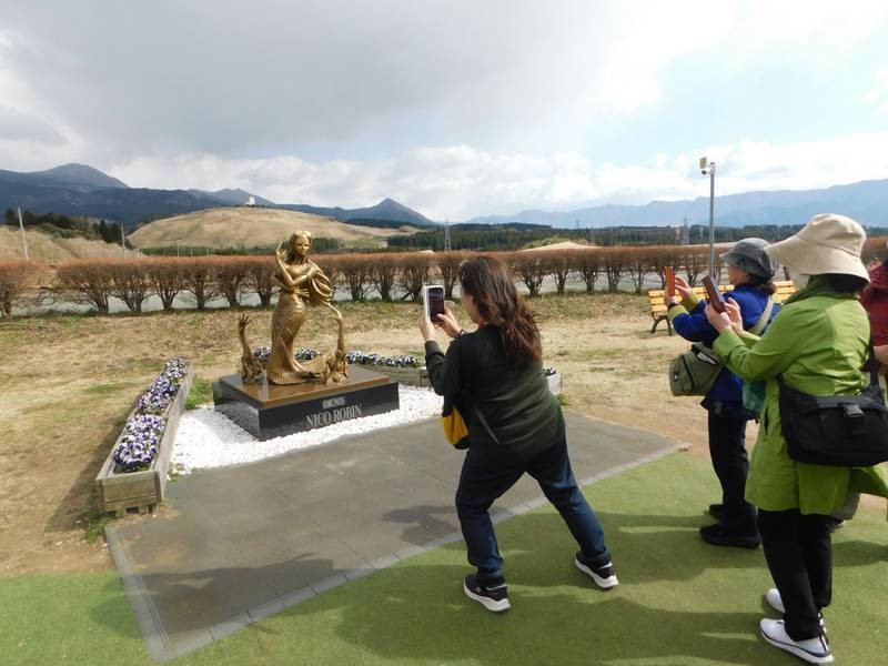 隣りの広場には地震で出現した「地表断層」が保存され、熊本復興プロジェクトの一環としてワンピース麦わらの一味である考古学者「ロビン」像が設置されています。